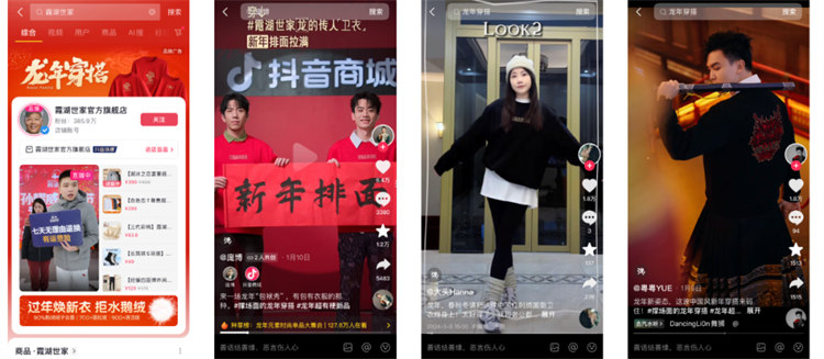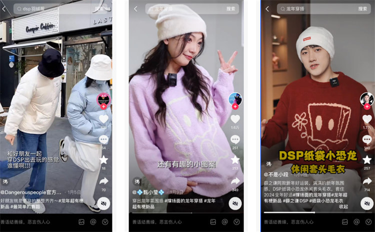 「抖in新風(fēng)潮·龍年超有?!够顒?dòng)上線#撐場面的龍年穿搭和#龍年超有梗新品兩大話題,引發(fā)消費(fèi)者的討論和關(guān)注。明星、達(dá)人緊跟熱點(diǎn),分享龍年新穿搭,展示了羽絨服、大衣、毛針織衫、衛(wèi)衣、保暖內(nèi)衣等不同品類服飾品牌的潮流態(tài)度。截至目前,相關(guān)話題的總播放量突破3億。