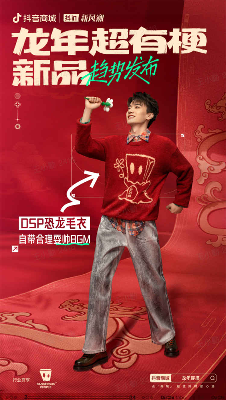 抖音電商與知名脫口秀達(dá)人龐博合作,發(fā)布「龍年超有?!苟ㄖ埔曨l、平面海報(bào),為活動(dòng)造勢?;顒?dòng)期間,抖音電商發(fā)布「龍年超有?!ば缕汾厔荨拐宫F(xiàn)國潮品牌風(fēng)采,并聯(lián)動(dòng)眾多達(dá)人為產(chǎn)品精準(zhǔn)種草。