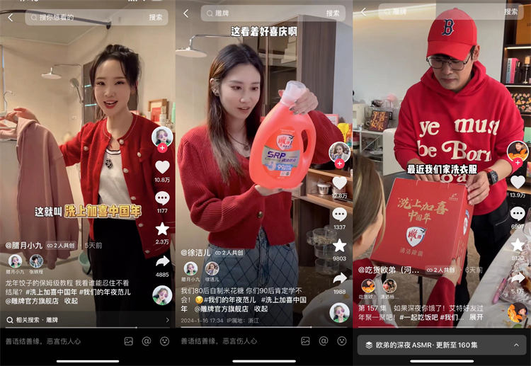 同樣,新時代的年味,相信很多人也發(fā)現(xiàn)了另一個新變化,家家戶戶越來越注重“新年儀式感”,比如來一場全家總動員的新春大掃除,一起感受洗舊迎新的喜悅。為此,納愛斯集團雕牌今年自創(chuàng)了品牌IP“洗上加喜中國年”,聯(lián)合巨量引擎與新華網(wǎng)共創(chuàng)春節(jié)創(chuàng)意視頻,跳出了籠統(tǒng)的產(chǎn)品功能角度,以春節(jié)核心的“家”為背景,展現(xiàn)了家人之間的無聲愛意,在春節(jié)這個喜團圓的氛圍中,感受生活中神秘的驚喜、家人牽掛的歡喜和家人成長的欣喜,引發(fā)了大家的情感共鳴。