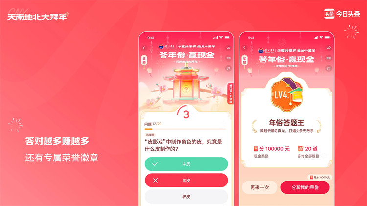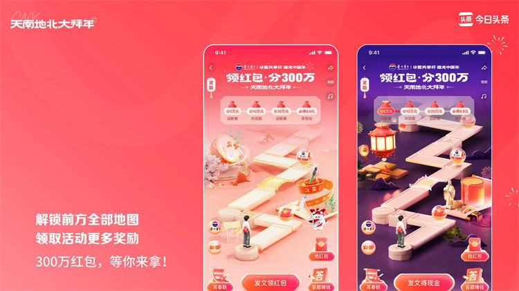 此次活動同步開啟了「南北話題PK賽」,邀請用戶分享南北方不同的民俗、年夜飯和假期生活,助力家鄉(xiāng)陣營獲得勝利,瓜分豐厚的現(xiàn)金和流量大禮。同時,平臺還將收集到的所有用戶優(yōu)質(zhì)內(nèi)容,精心匯聚成一張拜年百景拼圖海報,展現(xiàn)全國各地的新春景象。