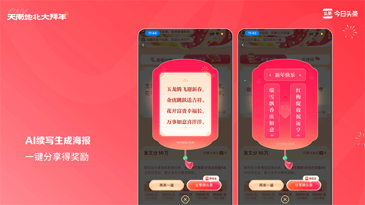 同時,活動平臺重磅上線“龍年春節(jié)”專屬頻道聚合活動玩法與內(nèi)容,頭條創(chuàng)作者們也紛紛獻上“花式拜年”之法,打造了一場趣味又實用的春節(jié)聯(lián)歡會。