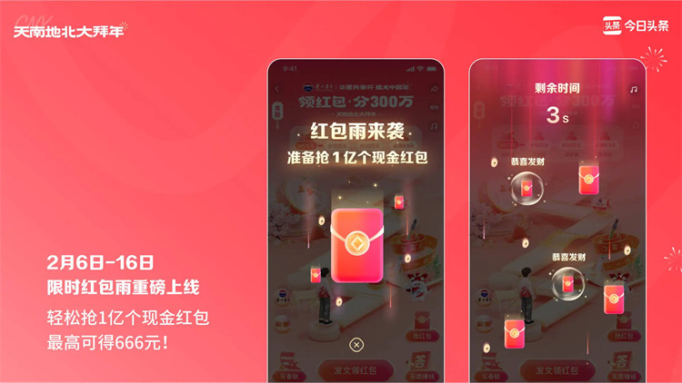 2月6日至16日,大拜年紅包雨重磅上線,用戶在指定時間進入活動頁面即可參與搶1億個現(xiàn)金紅包,最高可得666元。在其他時段,用戶仍可通過完成發(fā)文任務(wù)獲得抽紅包機會,輕松領(lǐng)現(xiàn)金。