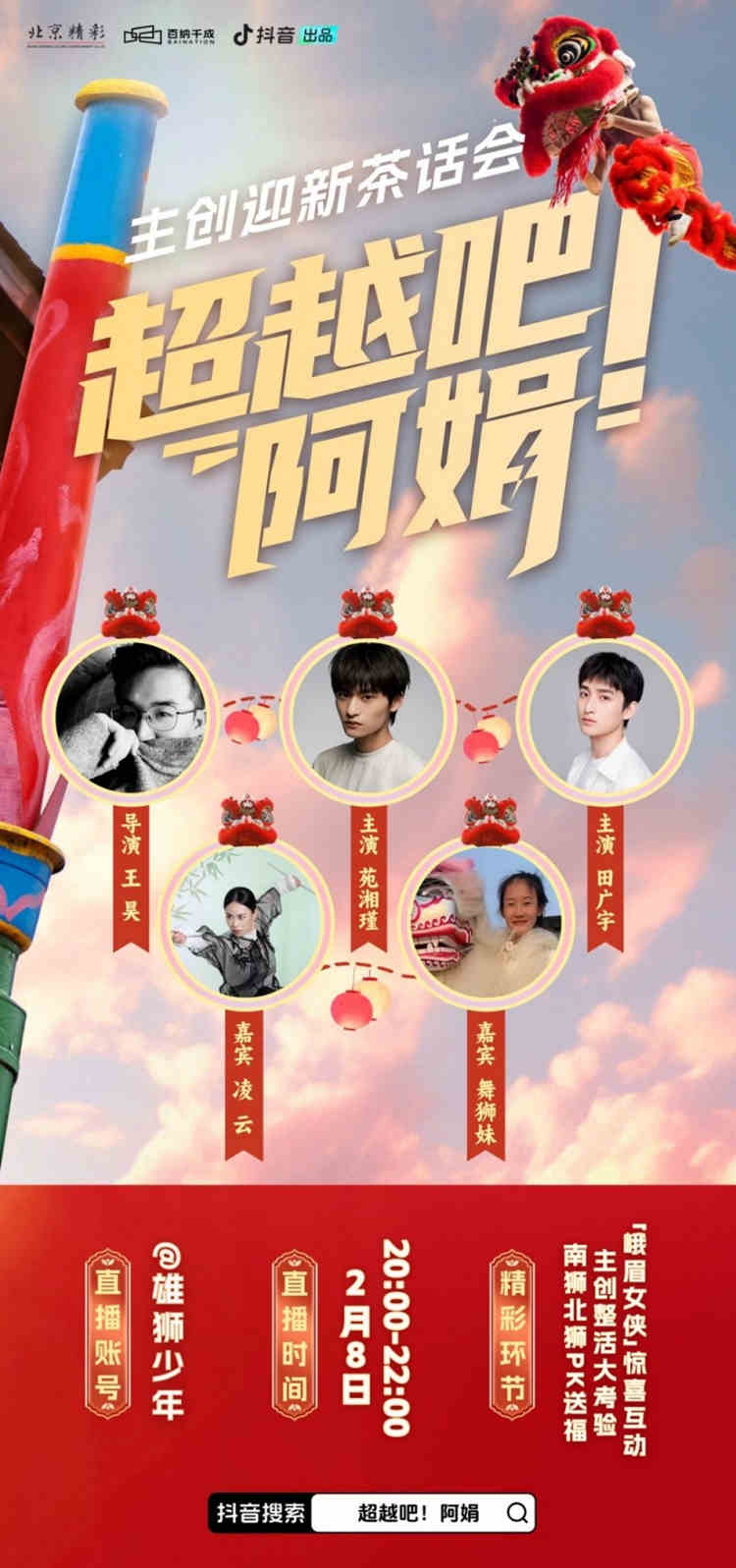 為了滿足觀眾的好奇心,新春前夕,《超越吧!阿娟》將在官方抖音賬號(hào)@雄獅少年 開(kāi)啟首次直播活動(dòng)!直播間里,《超越吧!阿娟》導(dǎo)演王昊、阿娟扮演者苑湘瑾、阿樂(lè)扮演者田廣宇,將與抖音達(dá)人@舞獅妹、@凌云一同展開(kāi)有趣互動(dòng),同時(shí)為廣大網(wǎng)友提前拜年!
